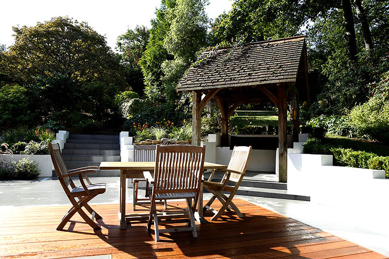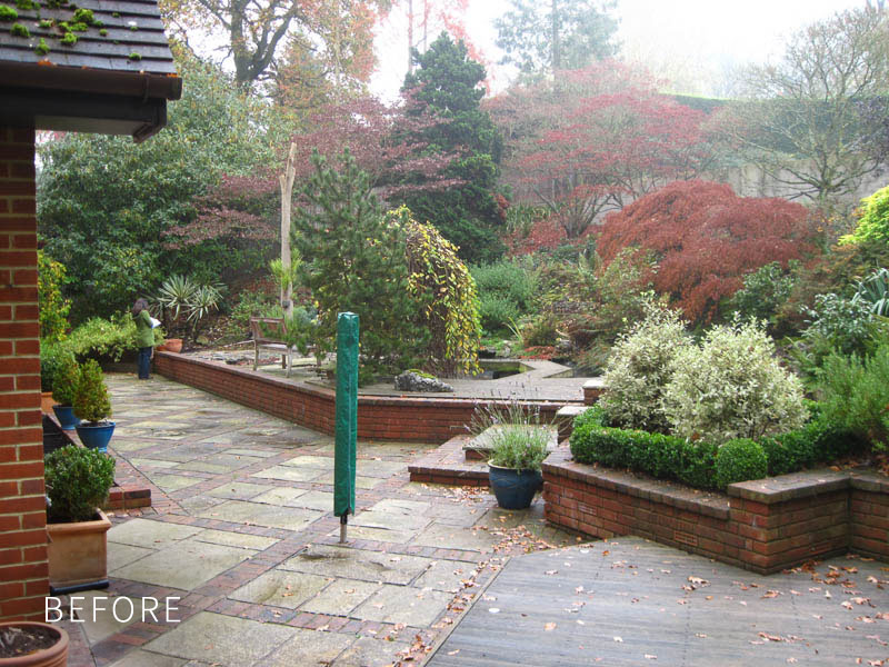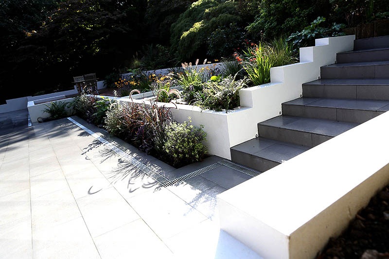 A clean and contemporary design to allow the space to flow smoothly from the new kitchen/living room extension, to feature a cascading water feature down the slope of the garden and the removal of a large pond to create more room for entertaining.