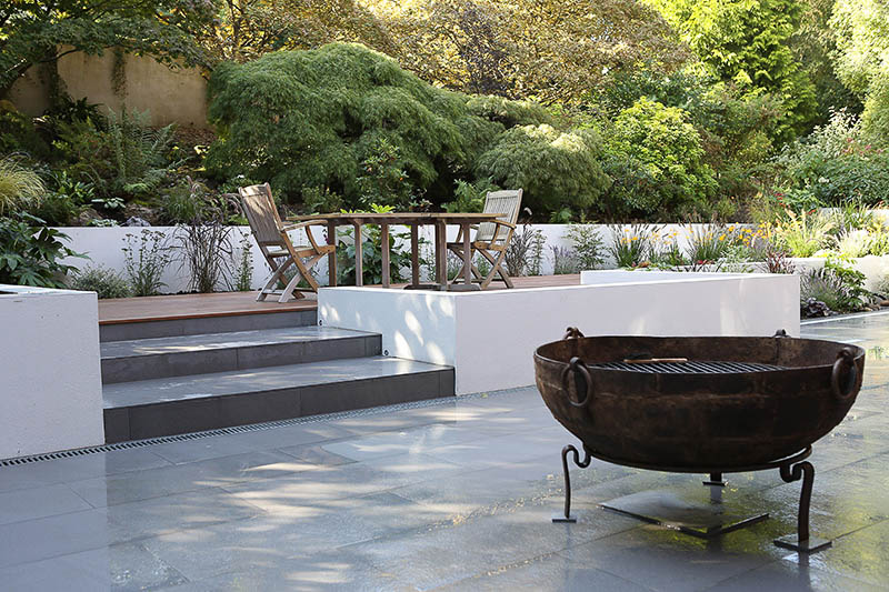 The pond area is filled in to create an upper, decked terrace using Ipe hardwood. Water flows through a letterbox opening along a steel rill and then down into a pool on the lower terrace. Clean, rendered, retaining walls throw light into the space while a lower dining area is delineated by an Ipe deck cut into the stone paving. Cool, lush planting surrounds the terraces.