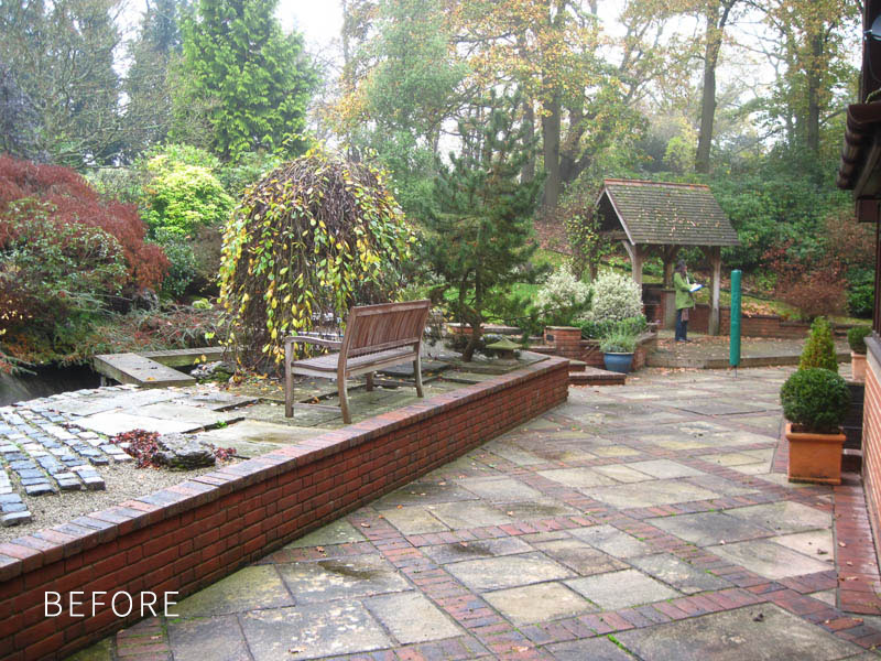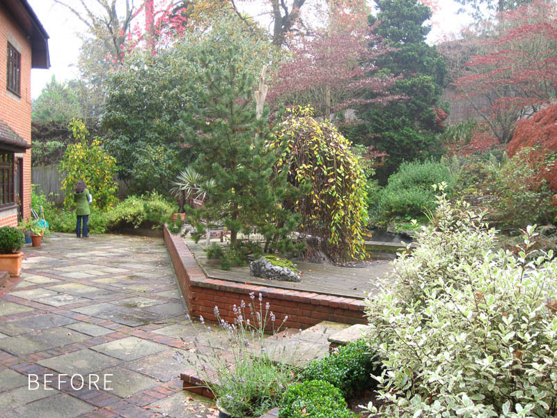 A steeply sloping site, surrounded by heavy mature planting that blocks out the light, the main feature of which is a dated-looking pond which takes up most of the existing useable space.