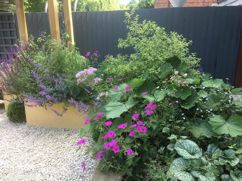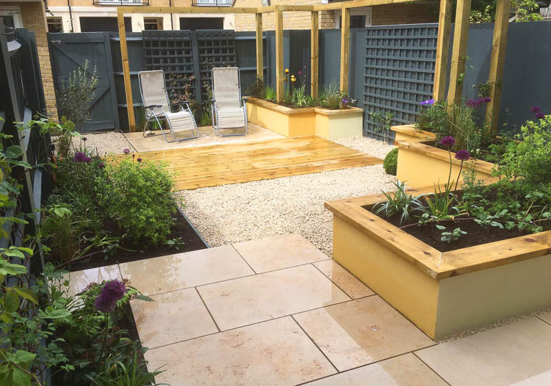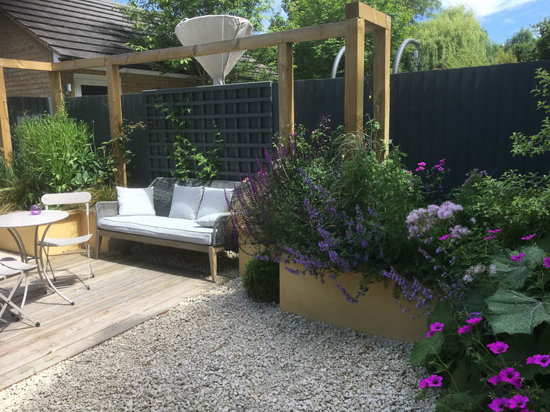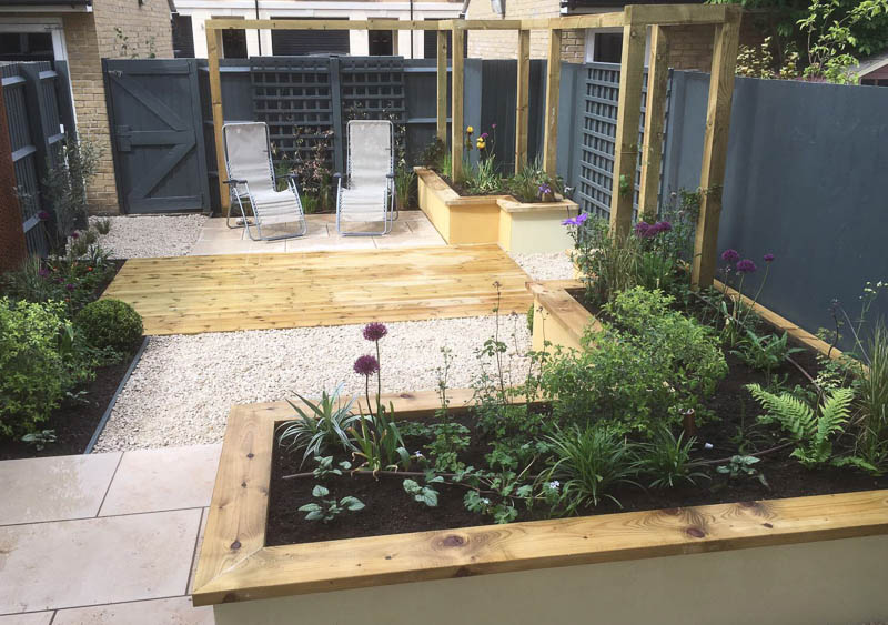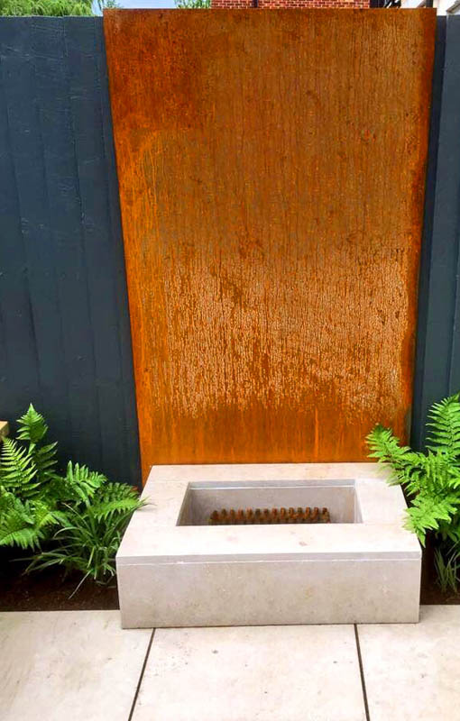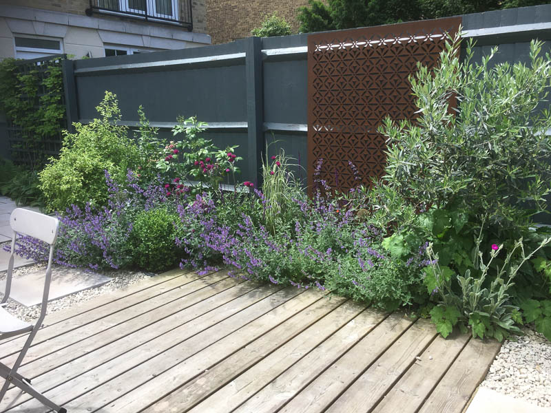 To make the areas directly adjoining the house more suitable for entertainment, raised beds were built to minimise draughts and create a more enclosed space and wall capping was added to allow for plenty of seating. A fire-pit was installed, balanced by a decorative cut corten steel panel opposite. The garden was re-focused along its sunnier side through the construction of a wooden pergola that culminates in two seating areas to fully enjoy what sun the garden receives.